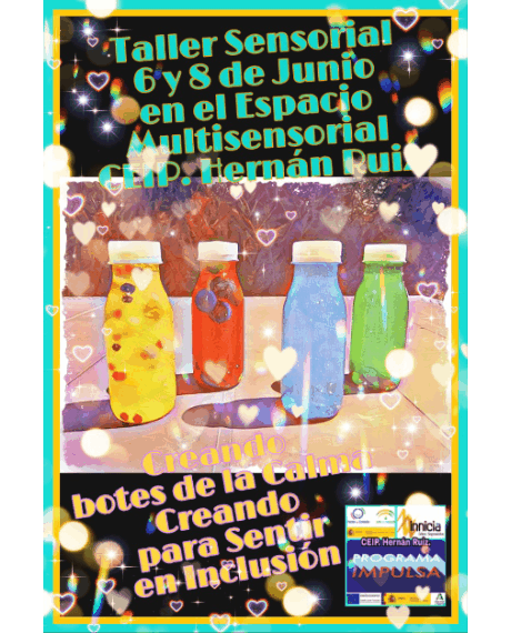 Taller Sensorial creamos botes de la Calma en Inclusión. Los días 6 y 8 de junio se impartirá un taller sensorial en el Espacio Multisensorial, en el cual el alumnado de nuestro cole creará botes de la calma para que queden como recurso y puedan ser utilizados en dinámicas multisensoriales en dicho Espacio.El taller será impartido por Sherezade Candeas, terapeuta, con una metodología emocional, multisensorial para favorecer procesos emocionales, sensoriales con los que estimular, procesos cognitivos, comunicativos para generalizar aprendizajes de áreas o ámbitos de aprendizaje que intervendrán en la creación de los botes de la calma.Este taller favorecerá la Coeducación e Inclusión entre alumnado participando Aula Específica y Aulas de Primaria que no participaron en el de Musicoterapia.Finalizado el taller multisensorial de botes de la calma que se ha desarrollado para Educación Especial y Primaria por el proyecto Impulsa Inclusión.Dicho taller impartido por Sherezade especialista en estimulación multisensorial, terapeuta, ha tenido como fin crear diversos botes de la calma como recurso para el uso del Aula Multisrnsorial, botes que se han creado en cooperación, Igualdad, Inclusión. Los botes de la calma se basan en técnica inspirada en el método Montessori, su elaboración ha potenciado generalizar aprendizajes. Su uso media en el desarrollo de aprendizajes, a la vez que se gestiona sentimientos, autocontrol y la autorregulació emocional.Un Taller Increíble.